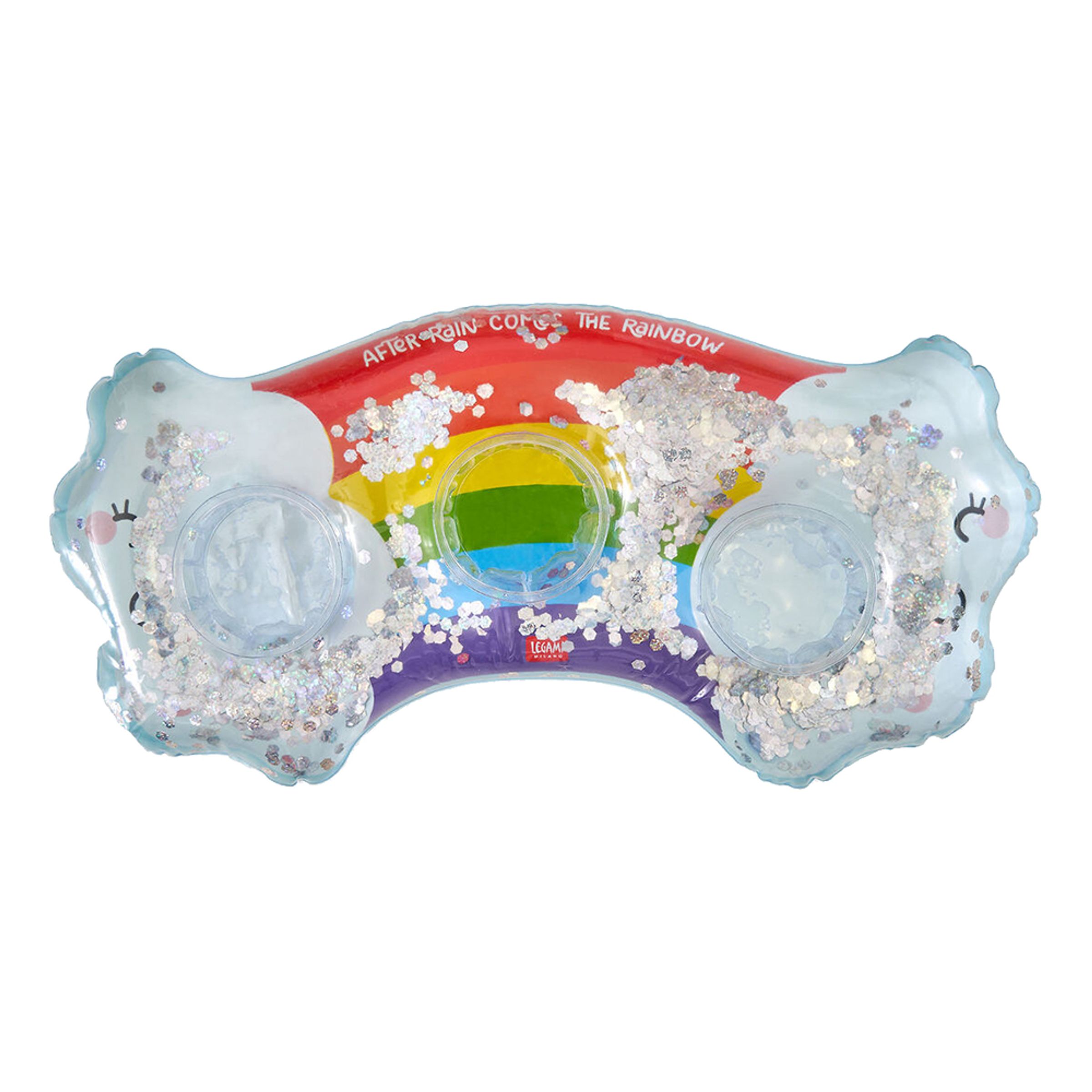 Uppblåsbar Drinkhållare Regnbåge är tänkt att ha i poolen, havet eller sjön och hjälper dig att hålla ordning på drinken. Den är uppblåsbar och kommer i formen av en färgglad regnbåge med glitter i. Drinkhållaren har plats för tre burkar.
