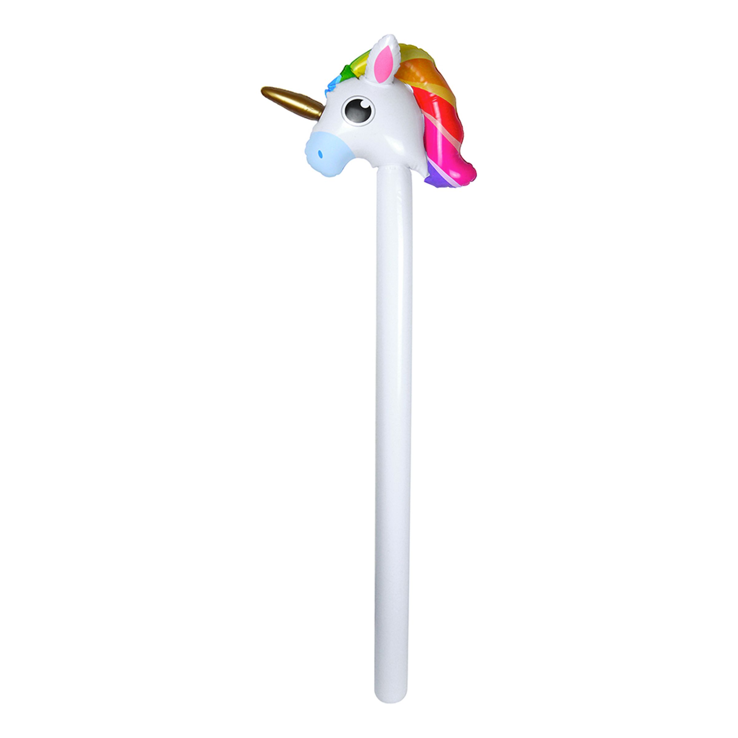 Uppblåsbar Enhörning Pinne innehåller ett vitt enhörningshuvud med ett guldfärgat horn och med en regnbågsfärgad man. Enhörningshuvudet är enkelt att blåsa upp och sitter på en lång uppblåsbar pinne. Den är 110 cm lång och är tillverkad i PVC-plast.