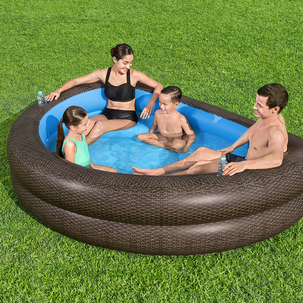 Denna uppblåsbara familjepool är den perfekta lösningen för varma dagar när du vill kyla av dig i en vattenpool hemma i trädgården. Denna uppblåsbar utomhuspool är tillverkad i slitstark plast och har en realistisk flätad design som ser ut som en riktigt trädgårdspool. Med två uppblåsta kuddar och mugghållare för bekväm sittning kan hela familjen svalka sig i denna uppblåsbara pool. Plastpoolen är enkel att montera och lätt att förvara när sommaren är slut.