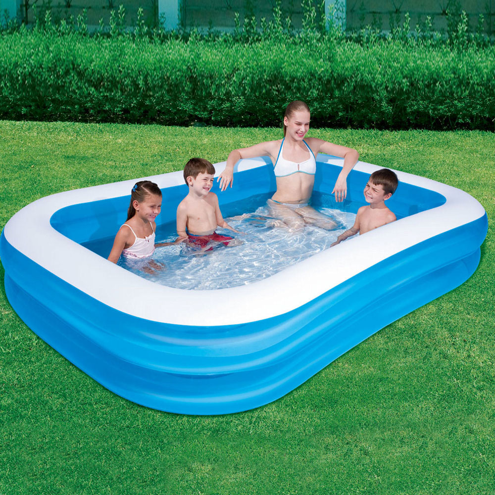 Uppblåsbar Familjepool omfattar en rektangulär uppblåsbar pool i blått och vitt.