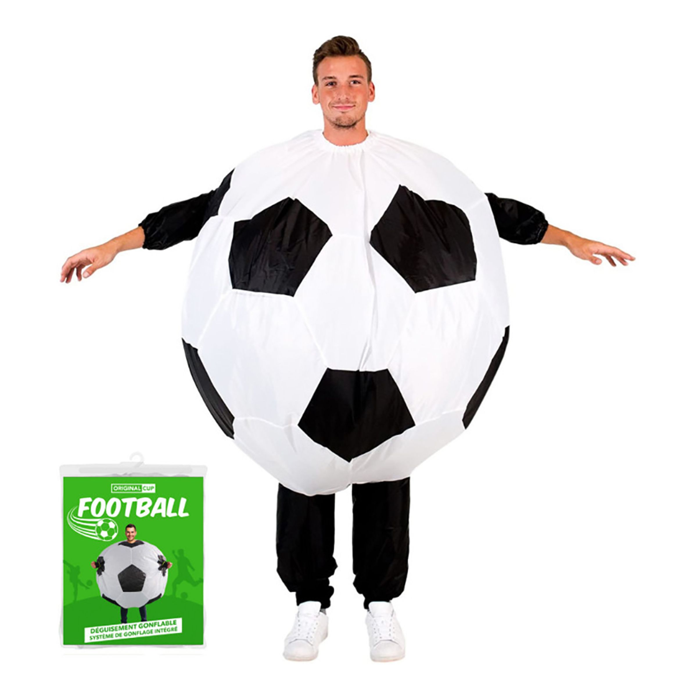 Uppblåsbar Fotboll Maskeraddräkt är en riktigt kul dräkt som får dig att se ut som en gigantiskt fotboll. Dräkten är uppblåsbar och drivs via en batteridriven fläkt som blåser upp dräkten konstant under kvällen. Batterifläkten sitter placerad diskret på baksidan av dräkten och drivs via 4 x AA-batterier (medföljer ej).