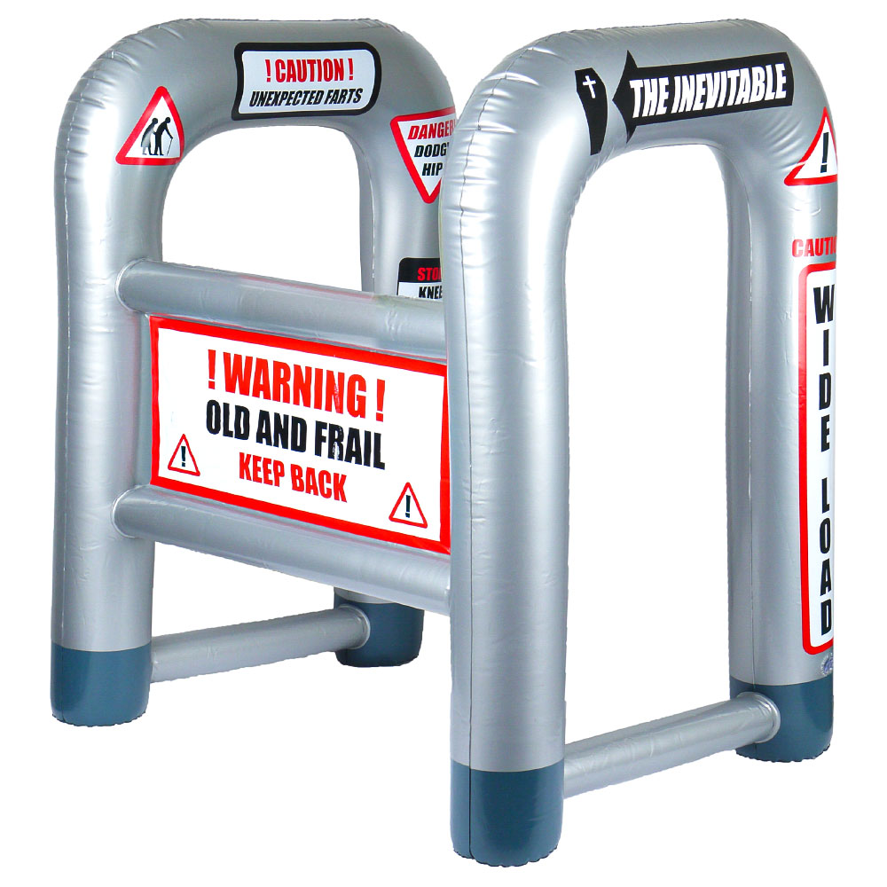 Uppblåsbar Gåstol innehåller en grå uppblåsbar gåstol med texten "Warning! Old And Frail Keep Back" framtill samt flera olika varningstexter och skyltar på sidorna. Gåstolen är tillverkad av PVC-plast och mäter ca 58 x 45 x 88 cm.