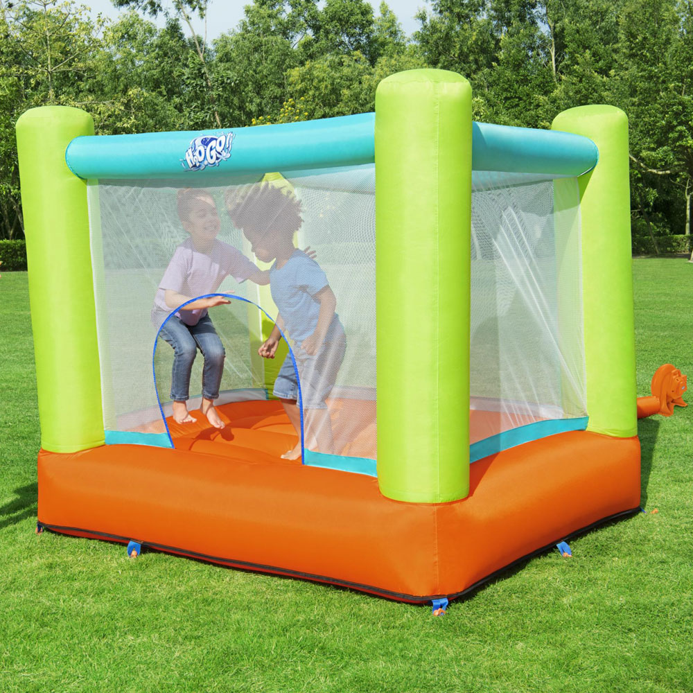 Uppblåsbar Hoppborg omfattar en uppblåsbar och färgglad hoppborg med nätväggar. Denna ena sidan har en liten entré för barnen att krypa in och ut genom. En automatisk uppblåsare på 220 V medföljer som blåser upp hela hoppborgen på ca 2 minuter. Hoppborgen är tillverkad i PVC-belagt polyestermaterial, har säkerhetsventiler och kan användas både inomhus och utomhus. Används hoppborgen utomhus finns åtta stycken pinnar att fästa i marken så att den står stadigt. Hoppborgen är ca 1,94 meter lång, 1,75 meter bred och 1,7 meter hög. Förvaringsväska och lagningslapp medföljer.