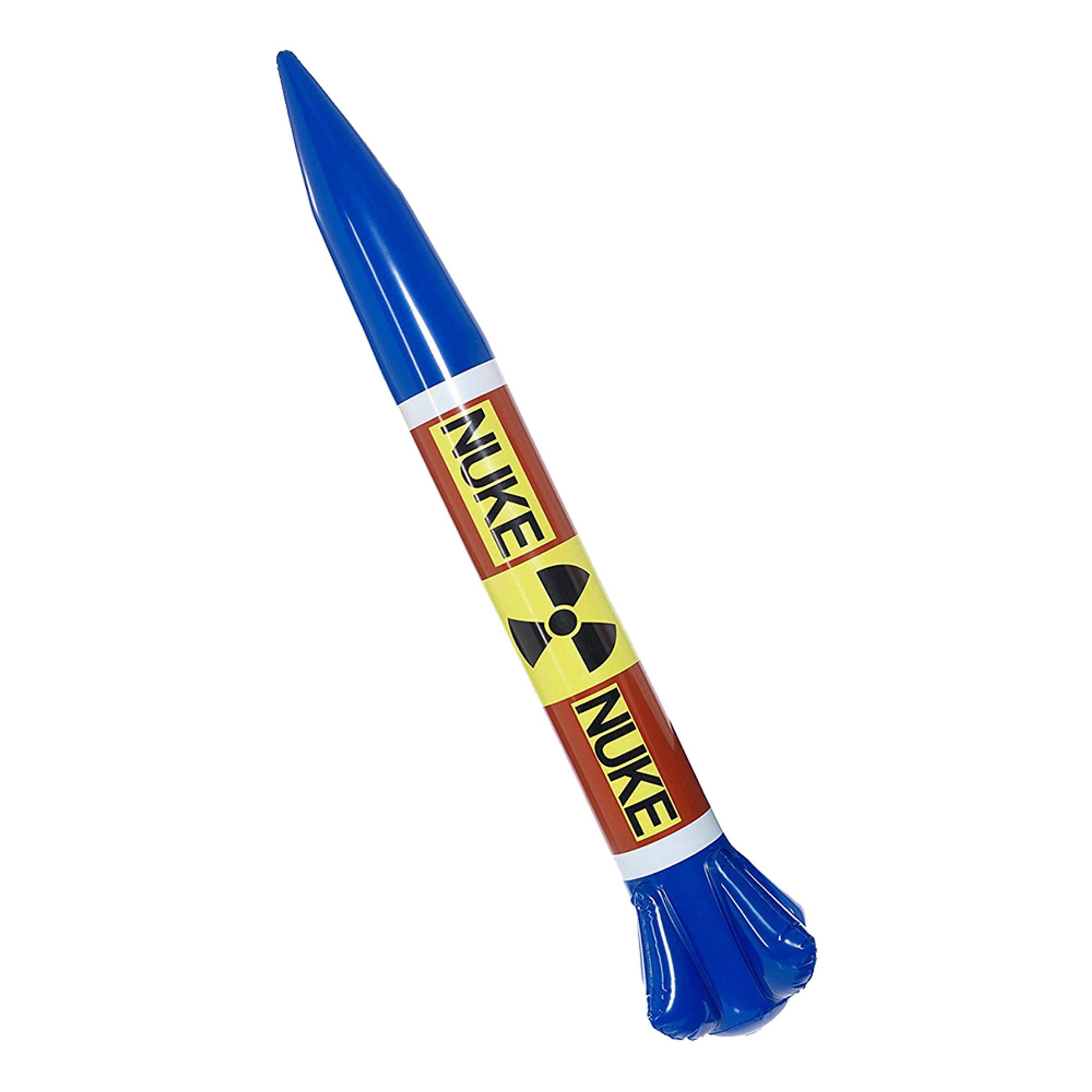 Uppblåsbar Kärnvapenmissil är en uppblåsbar blå missil med vita, bruna och svarta detaljer. Den mäter 87 cm x 13 cm och är av plastmaterial.