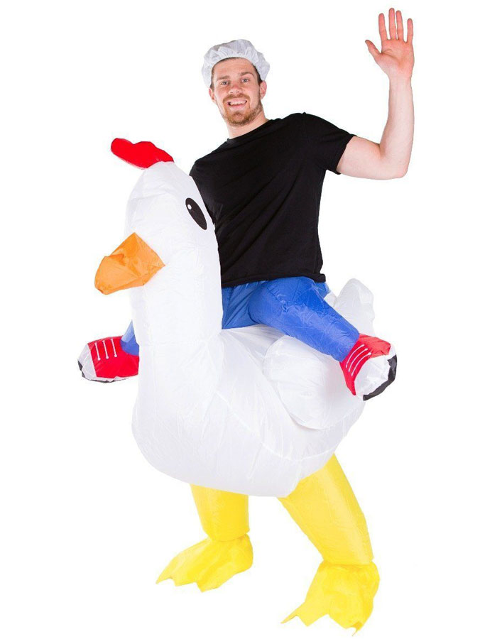 Uppblåsbar Kyckling Maskeraddräkt omfattar en uppblåsbar kycklingdräkt i vitt, med gula ben, orange näbb och röd tuppkam. Dräkten har även ett par blåa låtsas-ben på sidorna som gör att det ser ut som att du rider på kycklingens rygg. Ingår även en matchande vit hatt.