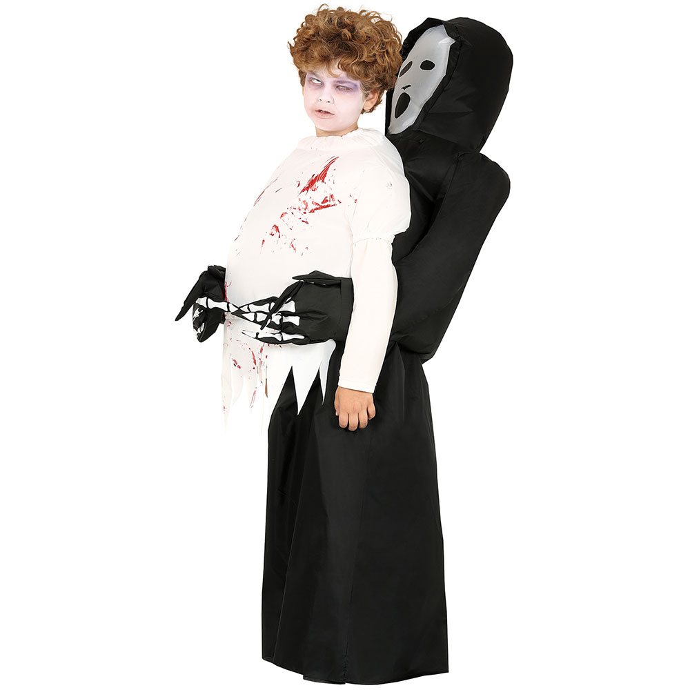 Ge ditt barn en oförglömlig Halloween eller maskerad med vår uppblåsbara dräkt med motiv av liemannen! Denna unika uppblåsbara maskeraddräkt för barn, med liemannen motiv, håller formen hela Halloween tack vare en inbyggd fläkt. Perfekt för en skrämmande rolig kväll!