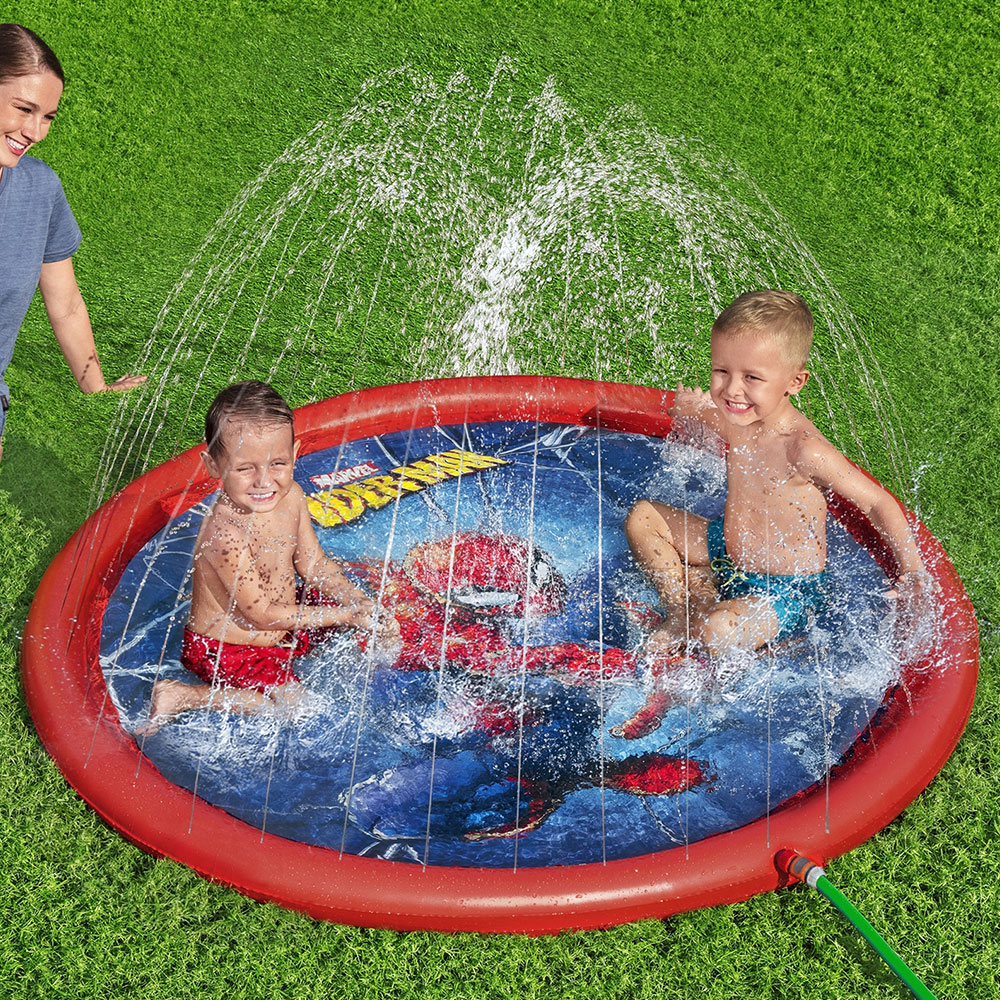 Uppblåsbar Plaskpool Spiderman Barn är rolig plaskpool som har flera sprinklers runt sig som sprutar in mot mitten och ger en häftig fontäneffekt. Poolen ansluts enkelt till trädgårdsslangen.