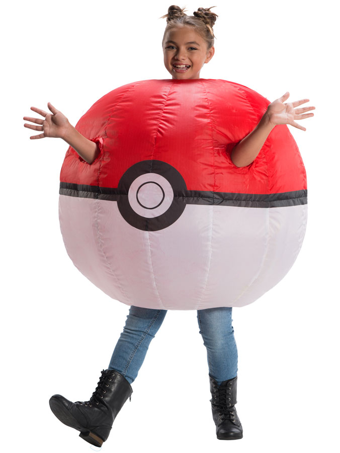 Uppblåsbar Pokéball Maskeraddräkt Barn består av en uppblåsbar maskeraddräkt i form av en Pokéball i rött, vitt och svart med dragkedja. Vid öppningarna för hals, armar och ben finns resår så luften hålls inne. Dräkten hålls uppblåst med hjälp av en liten inbyggd fläkt som driva av 4 stycken AA-batterier (batterier ingår ej).