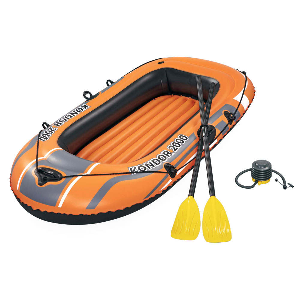 Uppblåsbar Roddbåt omfattar en orange uppblåsbar roddbåt i vinyl för barn och vuxna. Roddbåten är försedd med tre luftkammare, säkerhetsventil och låsbara luftningsventiler, grepprep längs hela båten och uppblåsbart golv. Roddbåten är ca 188 cm lång och 98 cm bred och har en maxvikt på 120 kg. Åror, fotpump och reparationslapp medföljer. Årorna är 124 cm långa.