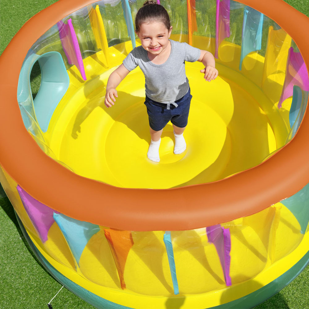 Med en uppblåsbar studsmatta med väggar kan ditt barn säkert hoppa och studsa omkring. Denna färgglada trampolin och bounce jam bouncer passar perfekt för små barn som förutom rolig lek också övar på grovmotorik, en uppblåsbar hoppborg som garanterat passar till rolig utomhuslek i sommar.