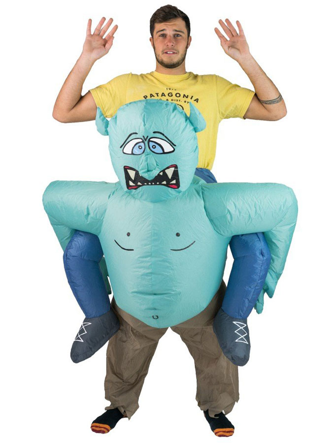 Uppblåsbar Troll Carry Me Dräkt består av en uppblåsbar maskeraddräkt som föreställer ett blått troll med läskigt ansikte och bruna byxor. Dräkten har också ett par låtsas ben på sidorna som gör att det ser ut som att trollet bär dig på ryggen.