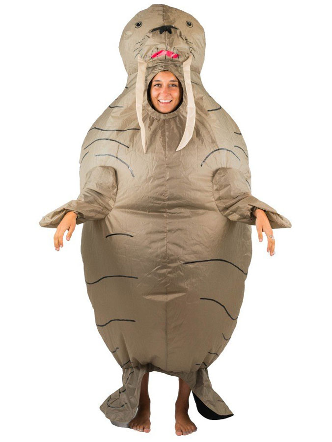 Uppblåsbar Valross Maskeraddräkt innehåller en uppblåsbar maskeraddräkt som föreställer en valross i en grå-brun nyans. Dräkten har öppningar för benen och händerna, samt ett hål för ansiktet.