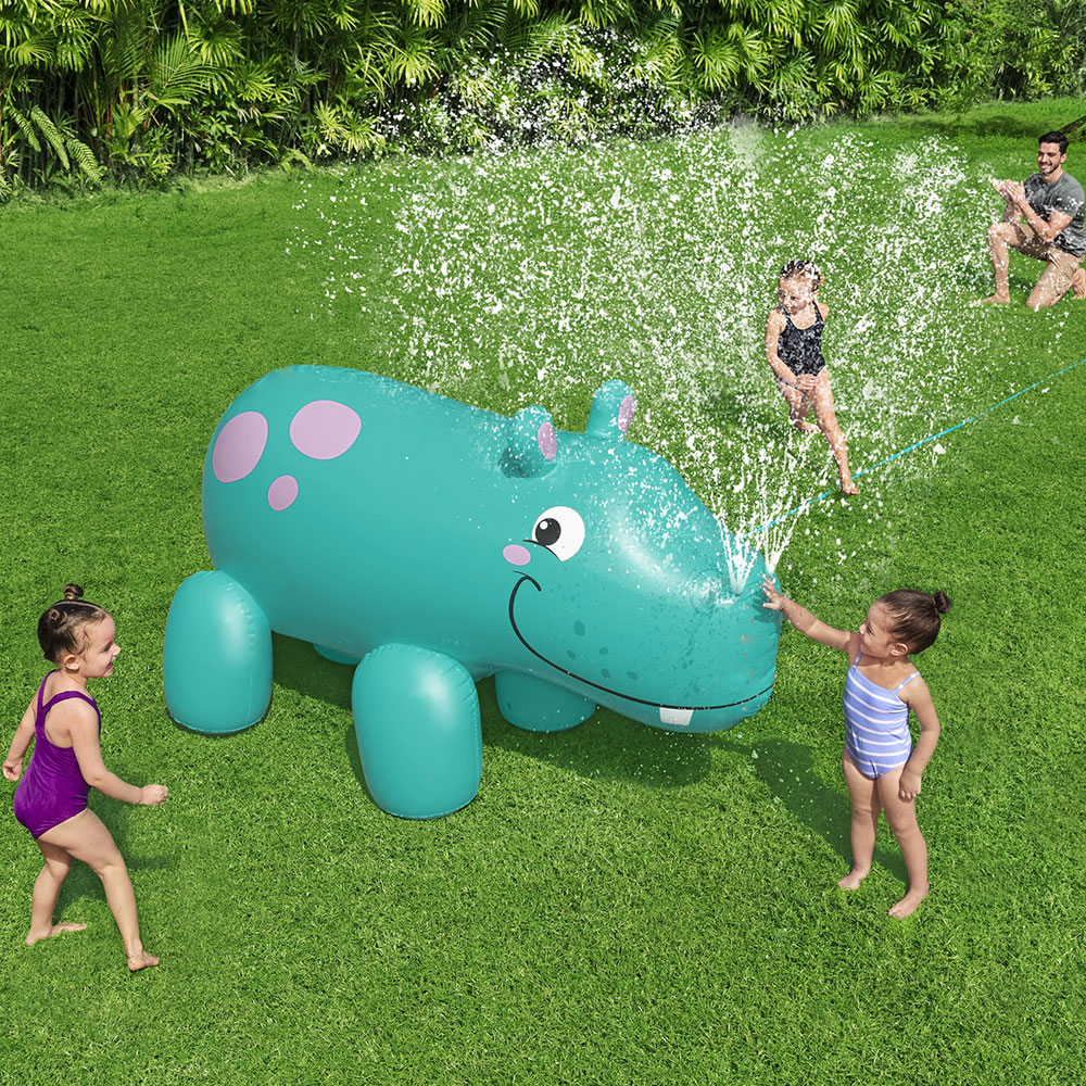 Uppblåsbar Vattenspridare Flodhäst är en uppblåsbar vattenspridare i form av en glad blå flodhäst med två sprayhål i sin nos. För ökad stabilitet finns en inbyggd vattenkammare och vattenspridaren ansluts enkelt till trädgårdsslangen.