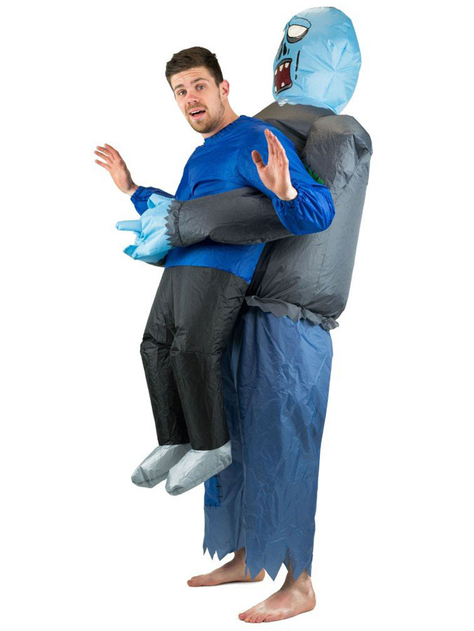 Uppblåsbar Zombie Maskeraddräkt består av en uppblåsbar maskeraddräkt som föreställer en blå zombie med läskigt ansikte. Dräkten har låtsas armar och låtsas ben som skapar illusionen av att zombien bär på dig.