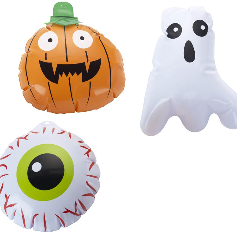 Uppblåsbara Halloween Dekorationer omfattar ett spöke, ett öga och en pumpa som är tillverkade av plastmaterial, och dessutom kommer som uppblåsbara. Varje dekoration har en ögla längst ovan som du kan använda för upphängning.