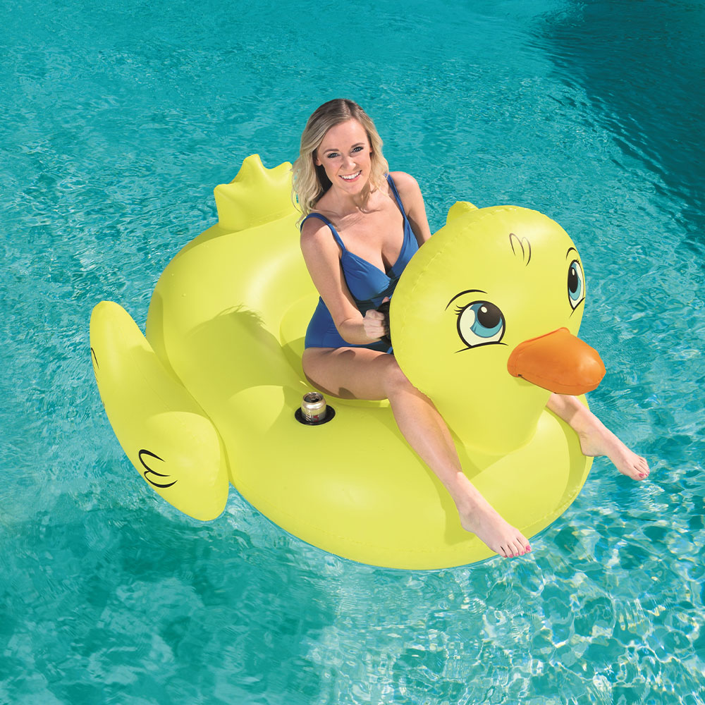 Uppblåsbart Baddjur Anka omfattar ett uppblåsbart baddjur i form av en gul anka med två svarta handtag på halsen och en drinkhållare. En lagningslapp medföljer.
