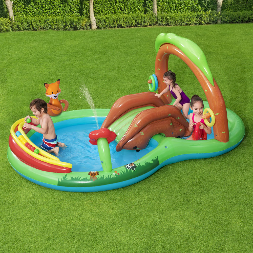 Uppblåsbart Vattenlekland Friendly Woods omfattar en uppblåsbar pool med roliga tillbehör för barn. Poolen består av en större och en mindre pool, rutschkana, kasta ring spel, flipperspel, basketkorg i form av en räv, vattenspridare i form av en blomma samt 10 stycken bollar. Den lilla poolen rymmer ca 111 liter och den stora ca 214 liter. Poolen ansluts med vattenslang och är tillverkad i slitstark PVC plast.