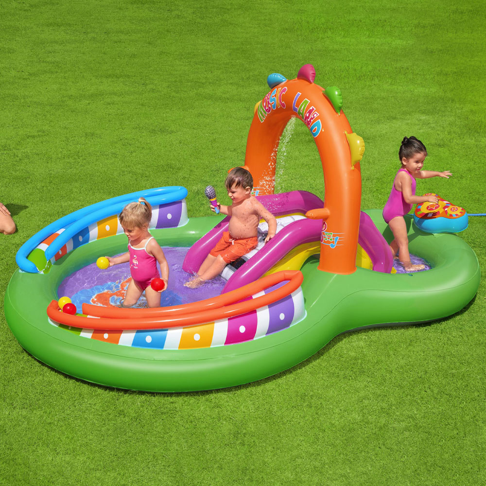 Superroligt uppblåsbart vattenland och vattenlekplats för barn med två barnpooler, sprinkler, rutschkana, bollspel, ringkastningsspel och uppblåsbara instrument, perfekt pool för vattenaktivitet och vattenlek hemma i er trädgård. Med Bestway barnbassäng och vattenlekland kan dina barn se fram emot svalkande och roliga dagar, en superkul uppblåsbar badpool och plaskpool med allt som behövs för skojig lek, en utmärkt barnpool och lekpool till sommarens varma dagar.
