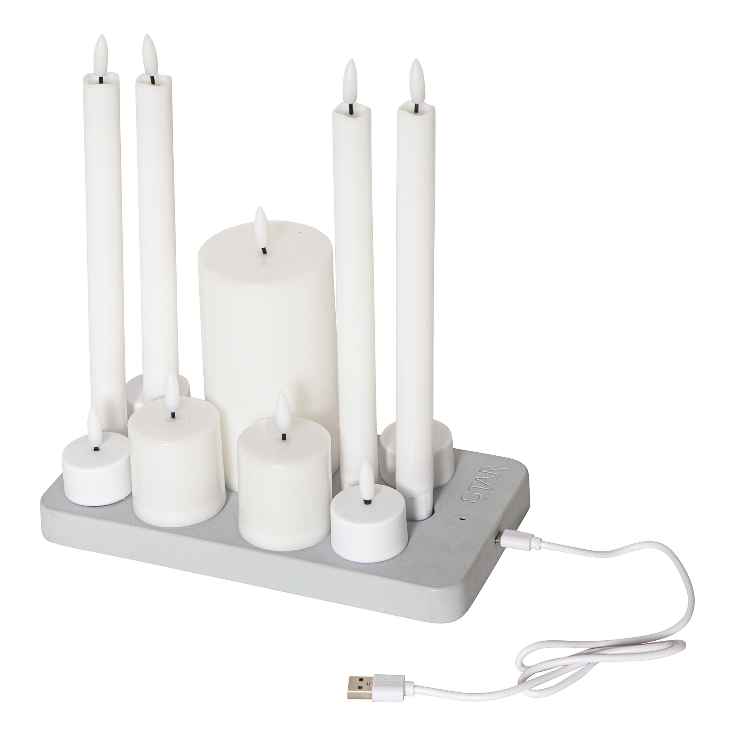 Uppladdningsbara LED Ljus Set är en uppsättning ljus i olika storlekar som är uppladdningsbara. Setet innehåller: 4 värmeljus (4×5 cm), 4 antika ljus (2×26 cm), 2 votivljus (5×8 cm) och 1 pelarljus (7,5×15 cm). Alla ljus är vita. Den medföljande laddningsplattan har även en medföljande 80 cm lång kabel med USB A-USB C-kontakter som enkelt kan kopplas in i en 5V-adapter, adaptern ingår ej.