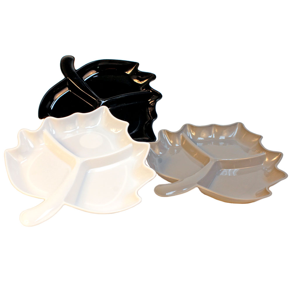 Uppläggningsfat Löv är ett rymligt uppläggningsfat i form av ett lönnlöv med tre sektioner. Finns i färgerna svart, vit eller grå, vilken du får blir en överraskning.