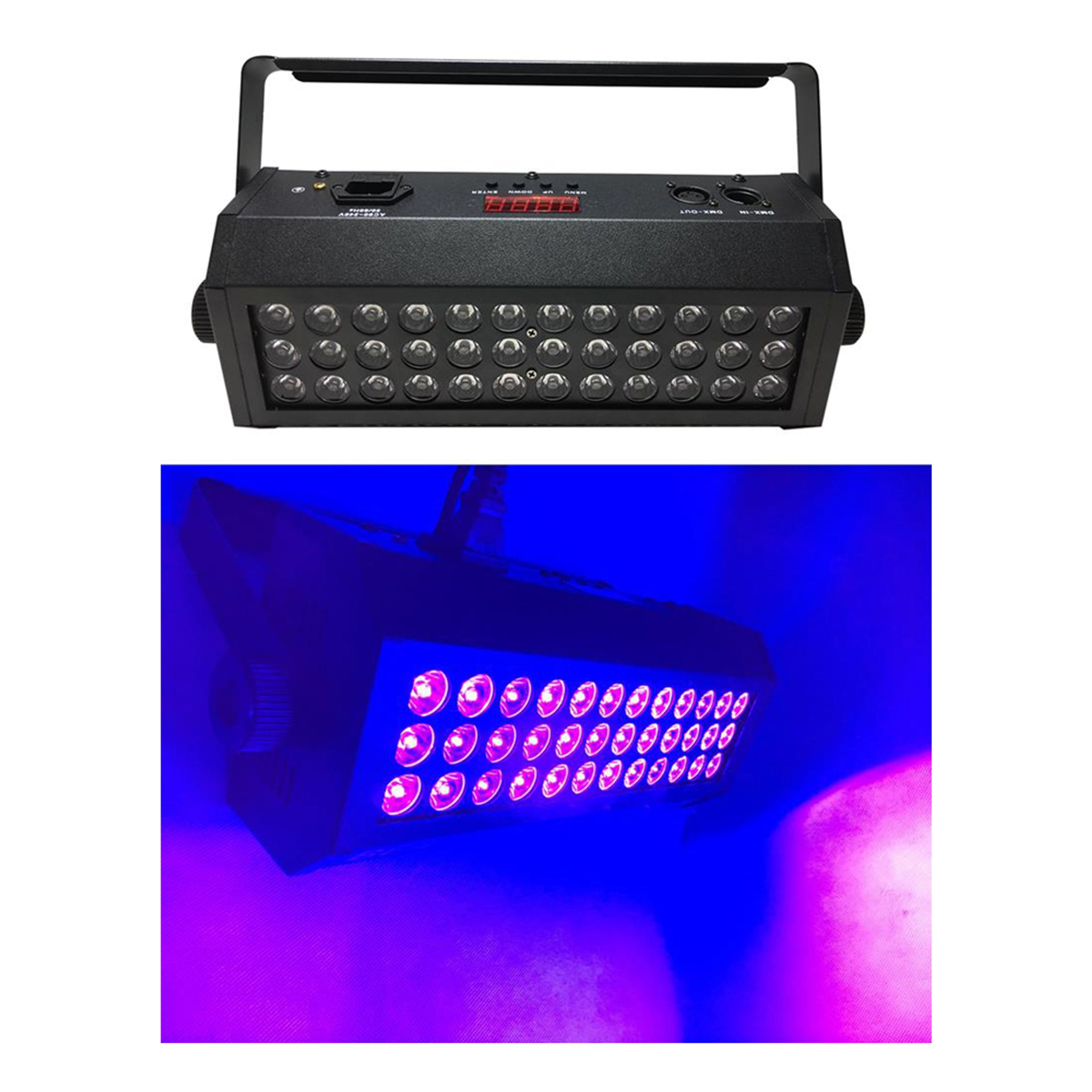 UV LED Blacklight innehåller en LED-lampa med 36 UV-LED-lampor med 3W vardera. Lampan mäter 39×21,5×16,5 cm och väger 2,5 kg. Smidigt upphängningsfäste för enkel installation. Säljs styckvis.