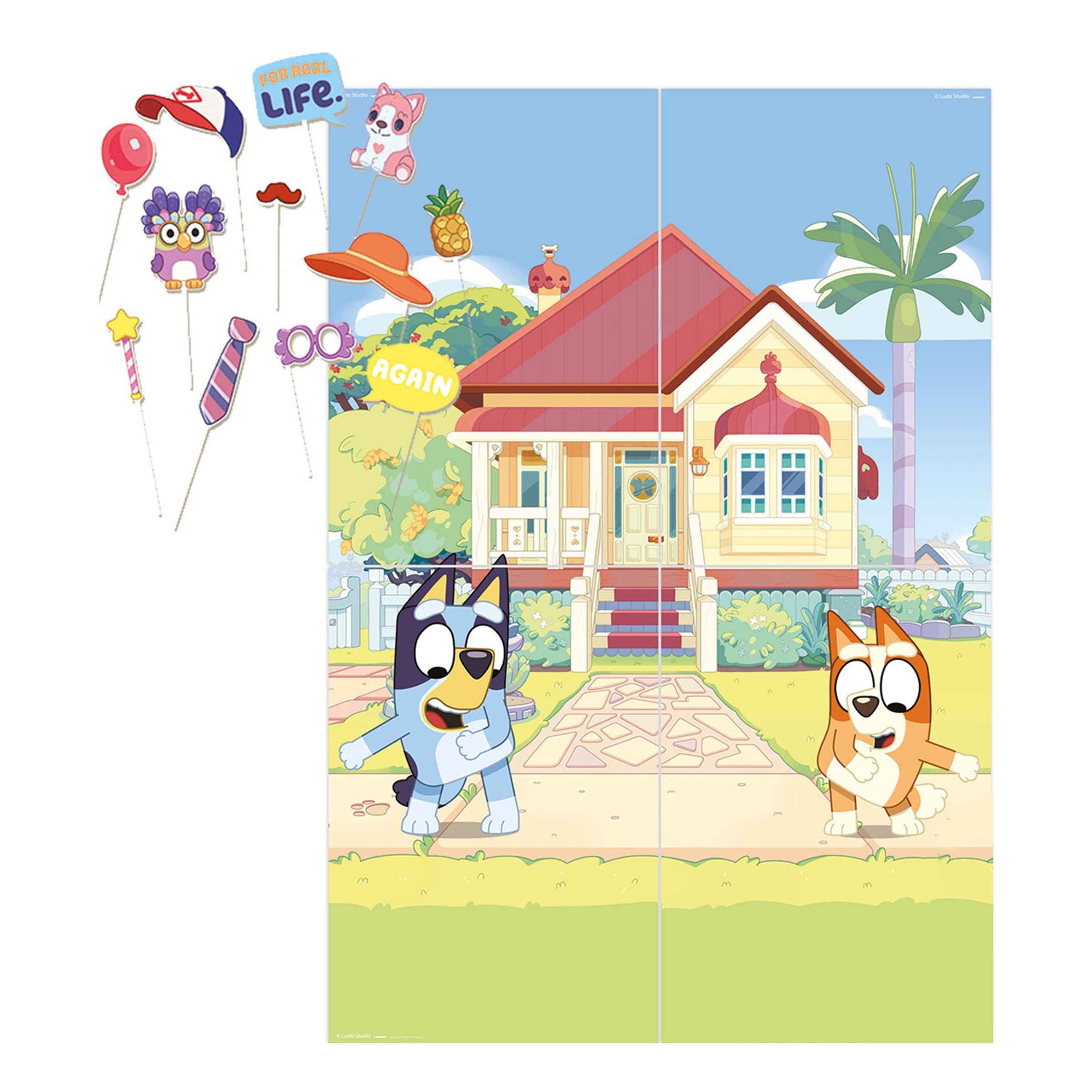 Väggdekoration Bluey inkluderar 4 stycken posters som bildar en bild på Bluey och Bingo framför deras hus. Det medföljer även 12 stycken fotoprops så ungarna kan ta roliga bilder!