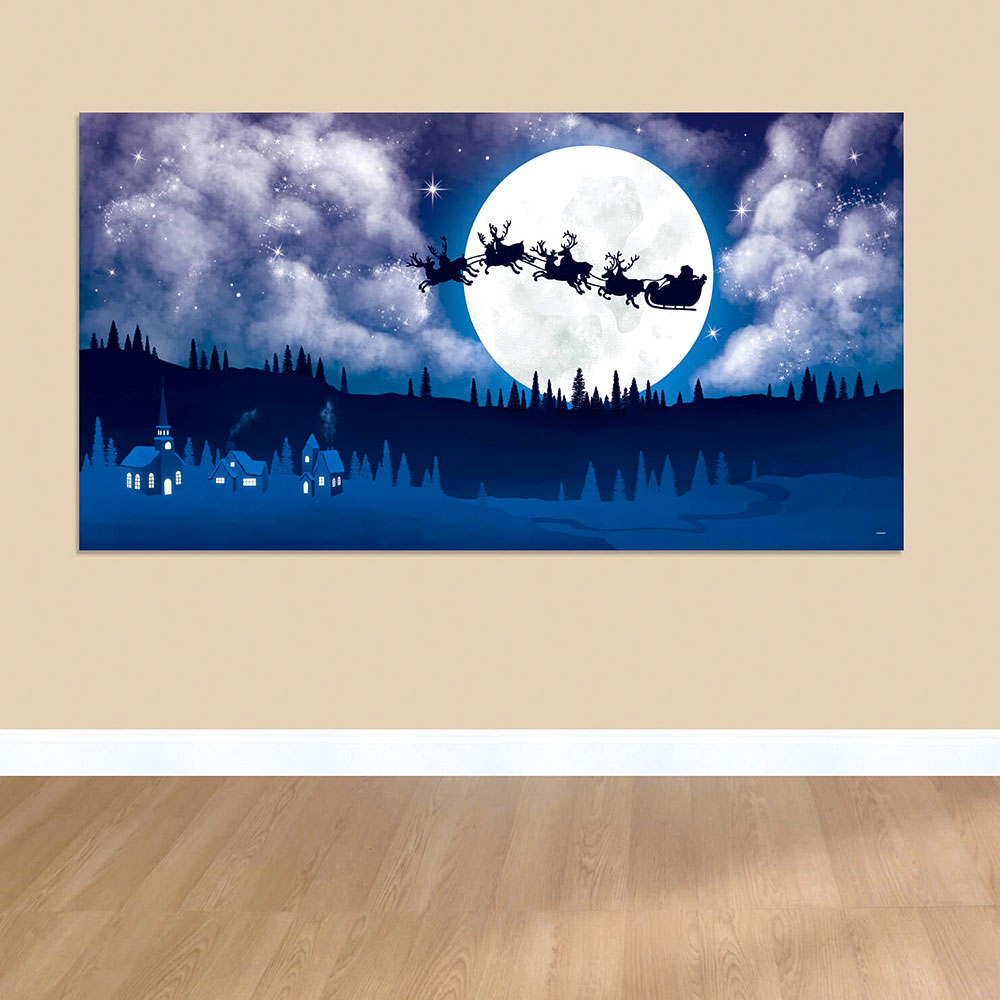 Väggdekoration Jultomtens Släde omfattar en väggdekoration av plast med motiv av jultomtens släde som flyger framför månen i ett vinterlandskap. Dekorationen är ca 85 x 165 cm stor, kan användas både inomhus och utomhus, och fästs enkelt på väggen med tejp eller liknande.