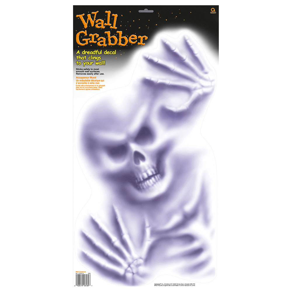 Väggdekoration Skelett omfattar en väggdekoration i form av ett återanvändbart klistermärke som ser ut som ett skelettansikte och händer som kommer ut från väggen.