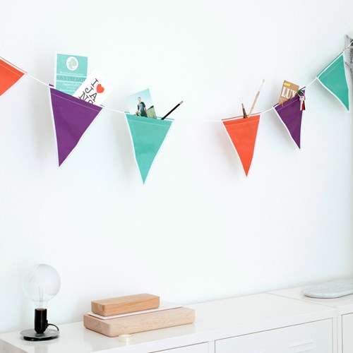 Håll rummet organiserat och festligt på samma gång med en färgglad vimpel! Varje flagga på denna vimpel har en ficka för småförvaring, som till t.ex. pennor, kort, leksaker och små block. Vill du ha i lite tyngre prylar har vimplarna dessutom ett självhäftande upphäng med kardborreband på baksidan för extra stöd. Vimpeln är lätt att hänga upp på väggen och du slipper hål efter spik eller skruvar!