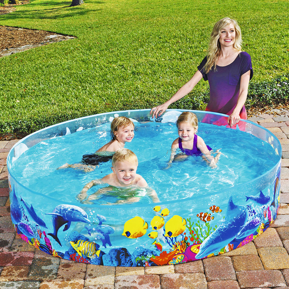 Ut och lek i denna härliga minipool för barn med kul havsmotiv och genomskinliga väggar! En perfekt bad-pool för alla barn, för lek och bus under varma dagar. Delfiner, fiskar och koraller i fina färger pryder denna plask-pool, som också går att se rakt igenom, vilket gör den till en extra kul lek-pool för ditt barn! En utomhus-pool är ett både enkelt och roligt sätt att busa runt och svalka varma barn, för massa skoj, en plastpool och egen badbassäng borde alla ha! Denna väggpool är också enkel att vika ut och fylla med vatten, utan något som behöver fyllas med luft, perfekt för otåliga barn (eller föräldrar). Denna Bestway barn-pool i plast har plats för många leksugna barn, en riktigt härlig vattenpool. Låt vattenleken börja i denna fina pool till ditt barn!