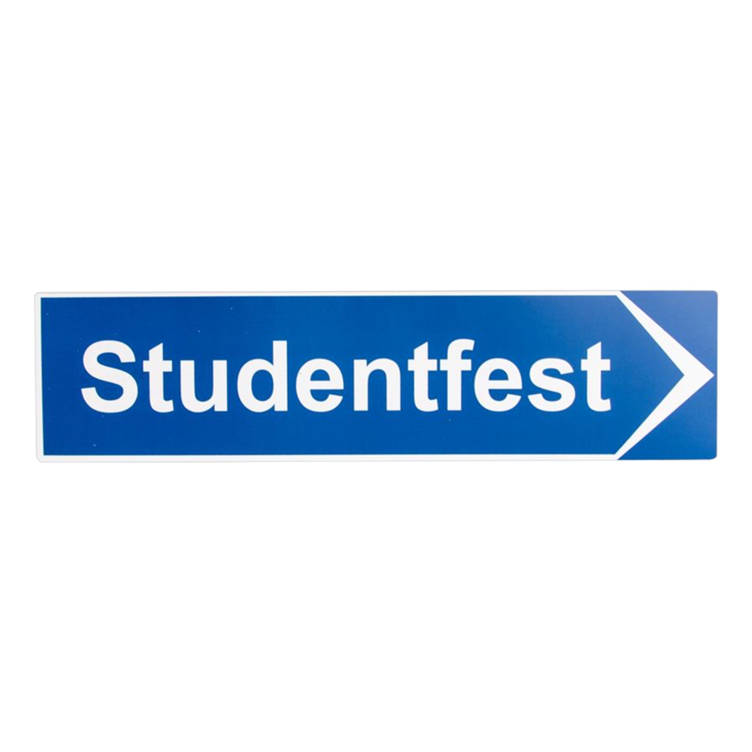 Vägskylt Studentfest är en blå skylt tillverkad i plast. Skylten ser ut som en riktig trafikskylt men på denna skylt står det "studentfest" med vita bokstäver.