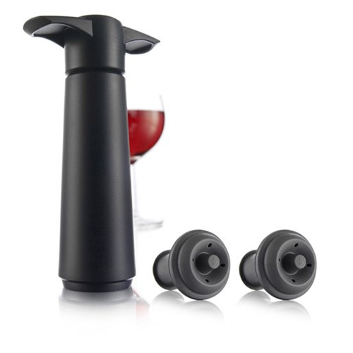 En vakuumpump som pressar ut luft från den öppnade flaskan och återförseglar med återanvändbara gummikorkar.