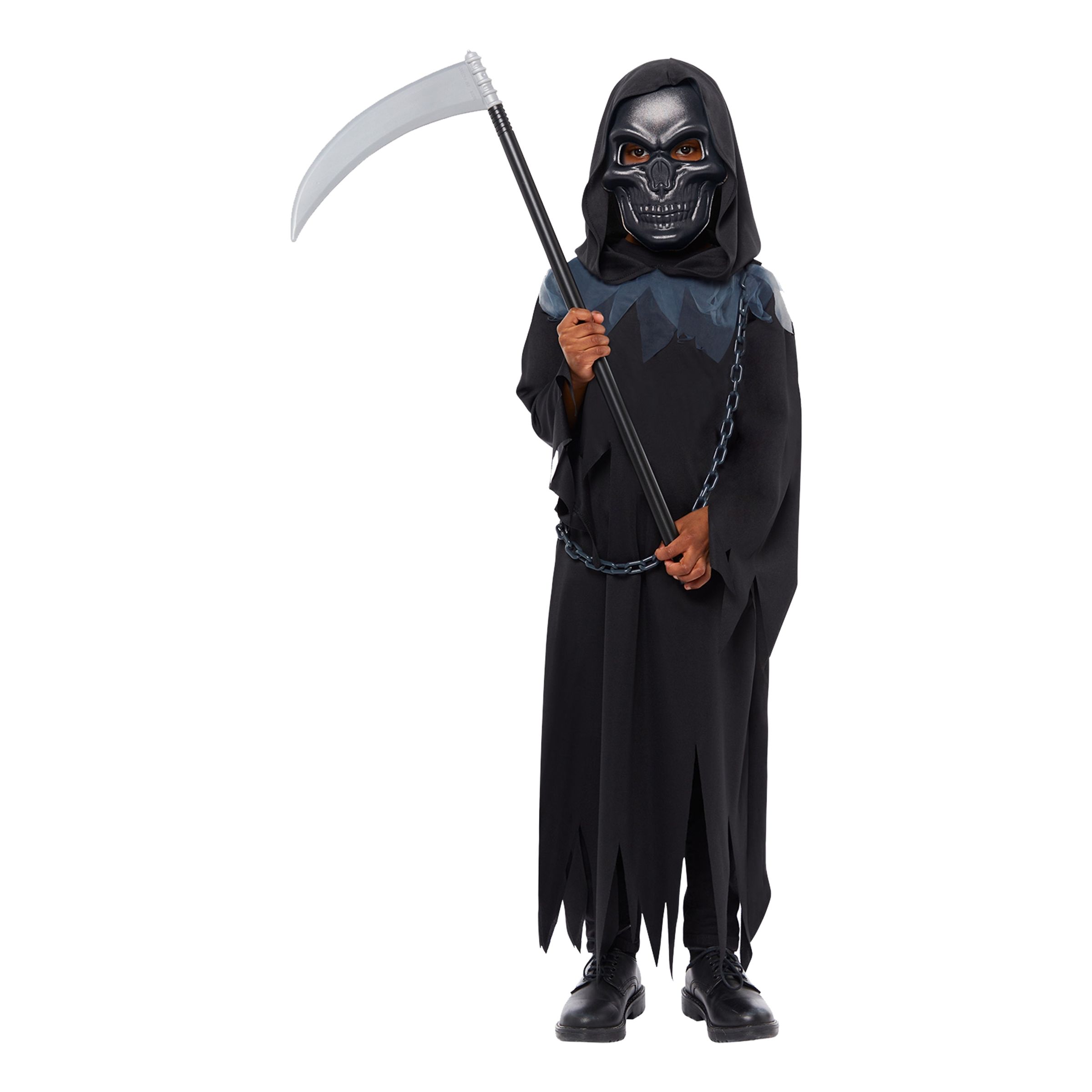 Vålnad Barn Maskeraddräkt inkluderar en svart tunika med taggiga kanter och en stor huva. På dräkten sitter det fast en plastkedja. Det medföljer även en läskig mask som gör dräkten extra läskig!