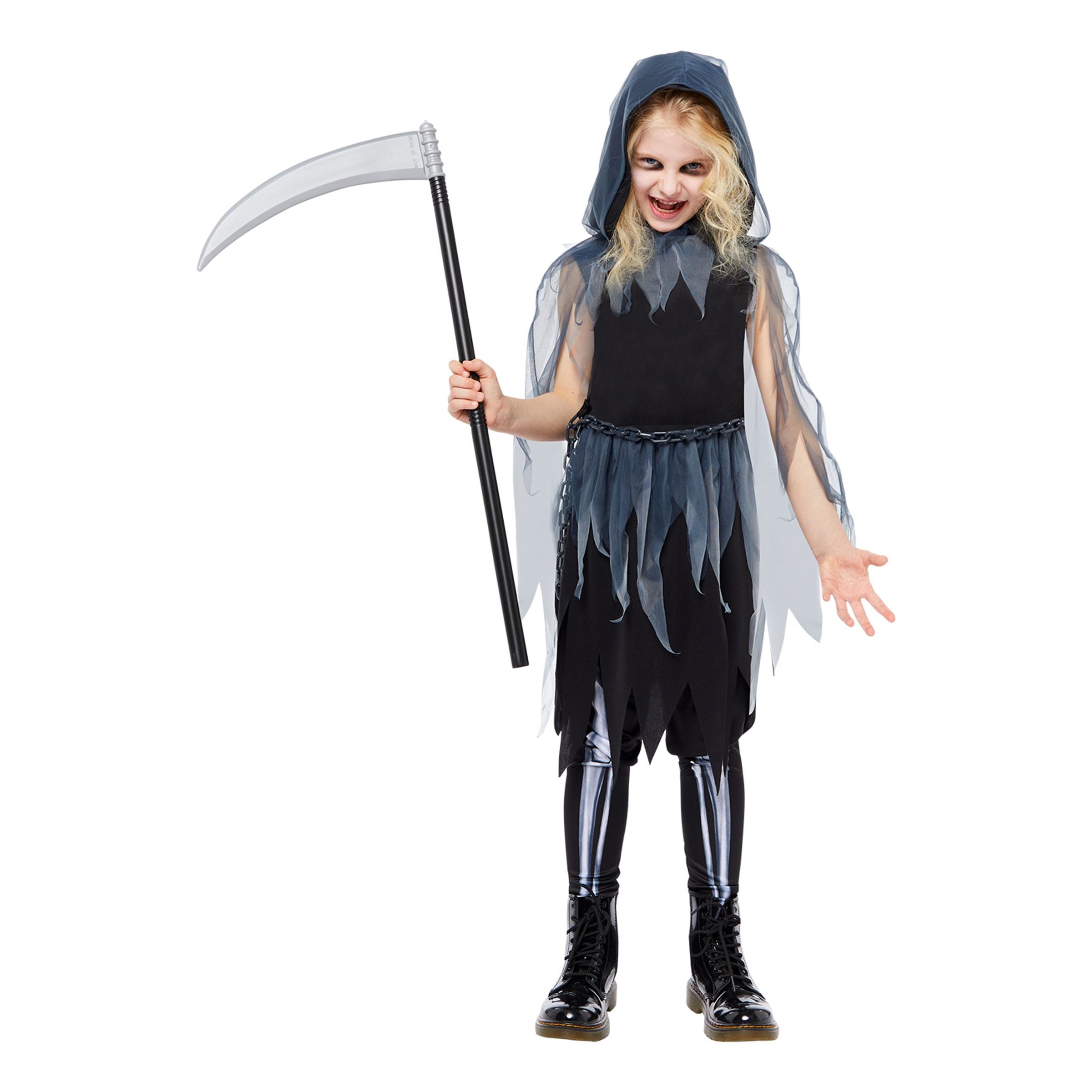 Vålnad Klänning Barn Maskeraddräkt inkluderar en svart ärmlös klänning, midjekedja och en grå cape med huva av meshtyg i sliten look samt ett par svarta leggings med vitt skelettmotiv på framsidan. Perfekt för trick or treat-rundan eller halloweenkalaset. Komplettera gärna med smink för en maxad spök-look!