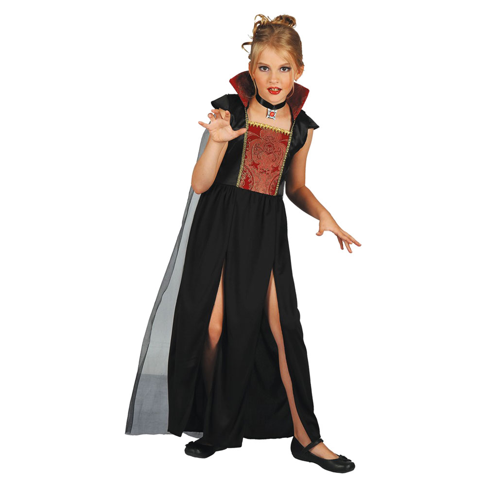 Förvandla ditt barn till en vampyr-prinsessa till Halloween maskeraden med en snygg vampyrklänning som utklädnad. Med den här stilfulla klänningen med en klassisk vampyrkrage och en fastsydd mantel är det här en perfekt dräkt till barnet som vill bli en nattens drottning till Halloween. Kombinera med en snygg vampyrsminkning och löständer för en riktigt snygg vampyr utklädnad.