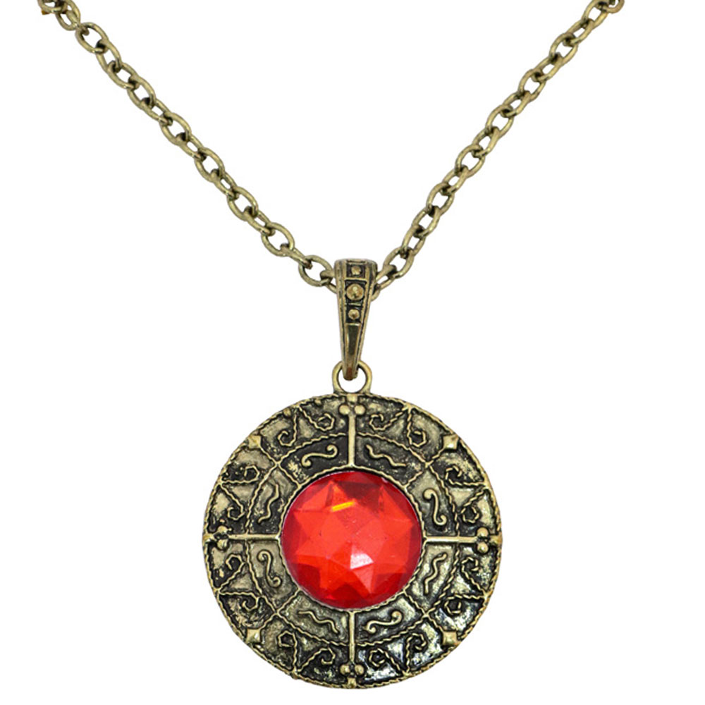 Vampyr Halsband omfattar ett mässingsfärgat halsband med en medaljong, dekorerad med en röd plastjuvel.