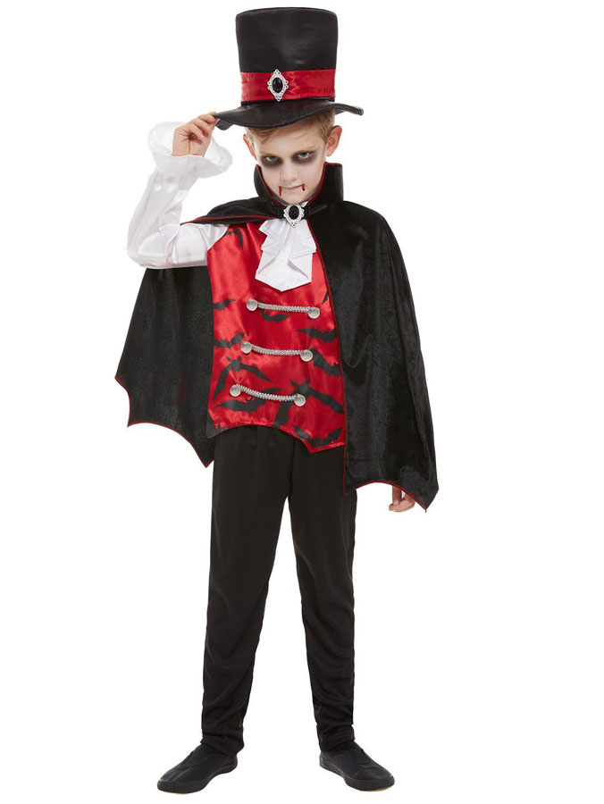 Vampyr Maskeraddräkt Barn innehåller en tuff vampyrdräkt för barn som består av en svart mantel med matchande ädelsten, en röd-vit skjorta med svart fladdermus motiv och silvriga detaljer, samt en svart hatt med rött band och svart ädelsten.