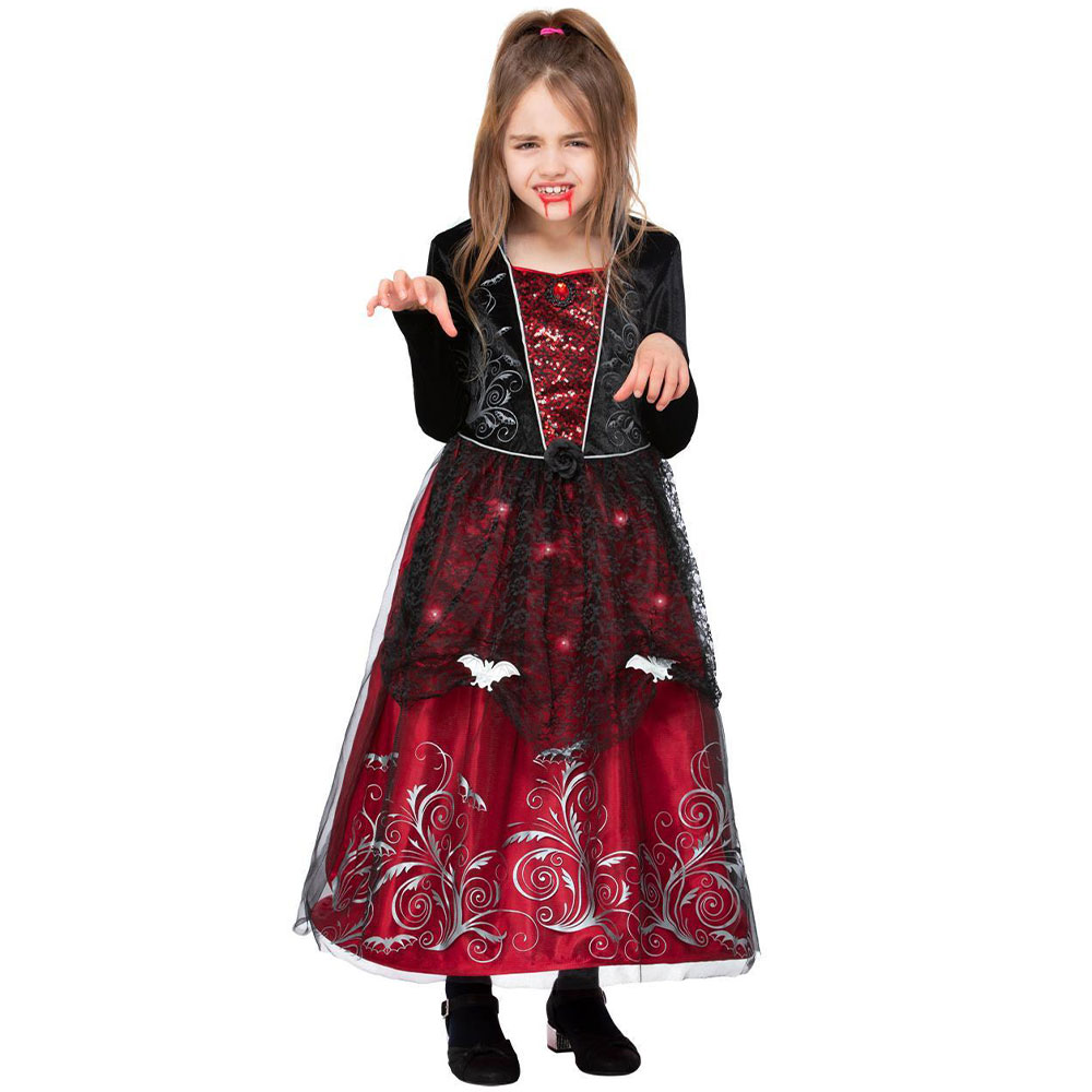 Vampyrklänning med LED Barn omfattar en vampyrdräkt för barn i svart och röd med vita detaljer samt LED-lampor. Dräkten inkluderar en långärmad långklänning.