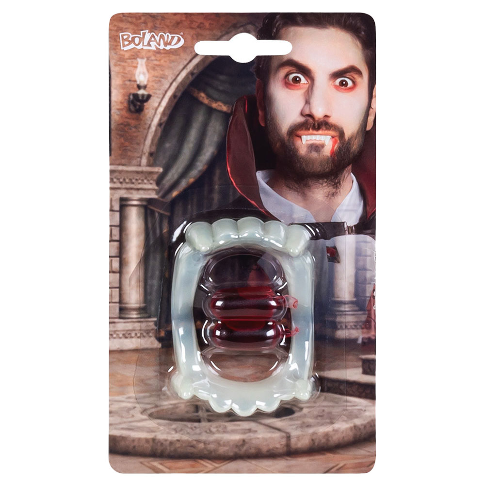 Vampyrtänder med Blodkapslar omfattar ett par vita vampyrtänder av plast samt två st blodkapslar som skapar en blodig effekt i munnen.