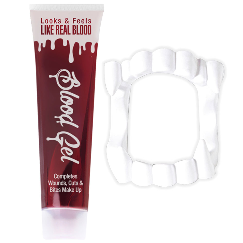Vampyrtänder med Fakeblod omfattar ett set med vampyrtänder av plast samt en tub med 28 ml rött låtsasblod. Blodet kan appliceras direkt från tuben och tvättas enkelt bort med tvål och vatten.