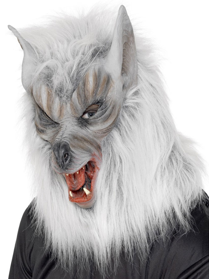 Vargmask med Vit Päls är en heltäckande, detaljrik vargmask med bloddrypande mun, utstickande vargöron samt vit päls omkring.