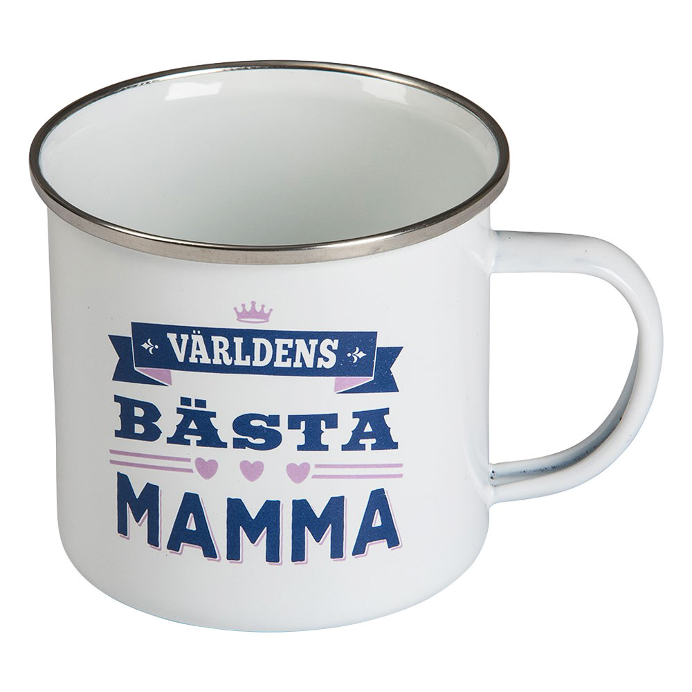 Världens Bästa Mamma Retro Mugg omfattar en vit mugg av emaljerad plåt med texten "Världens Bästa Mamma" i mörkblått och rosa. Muggen är ca 9 x 9,5 cm stor.