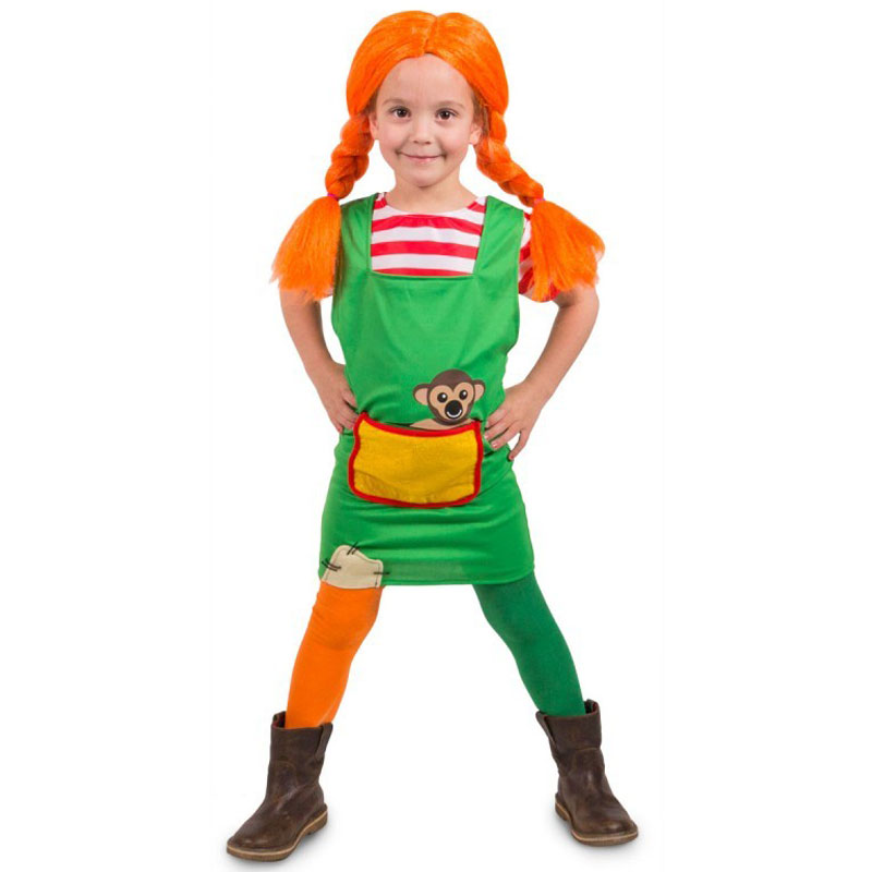 Världens Starkaste Flicka Maskeraddräkt omfattar en gul- och vitrandig skjorta med fastsatt grön klänning som har två lappar på vardera sida, en stor ficka framtill samt en apa tryckt ovanför.