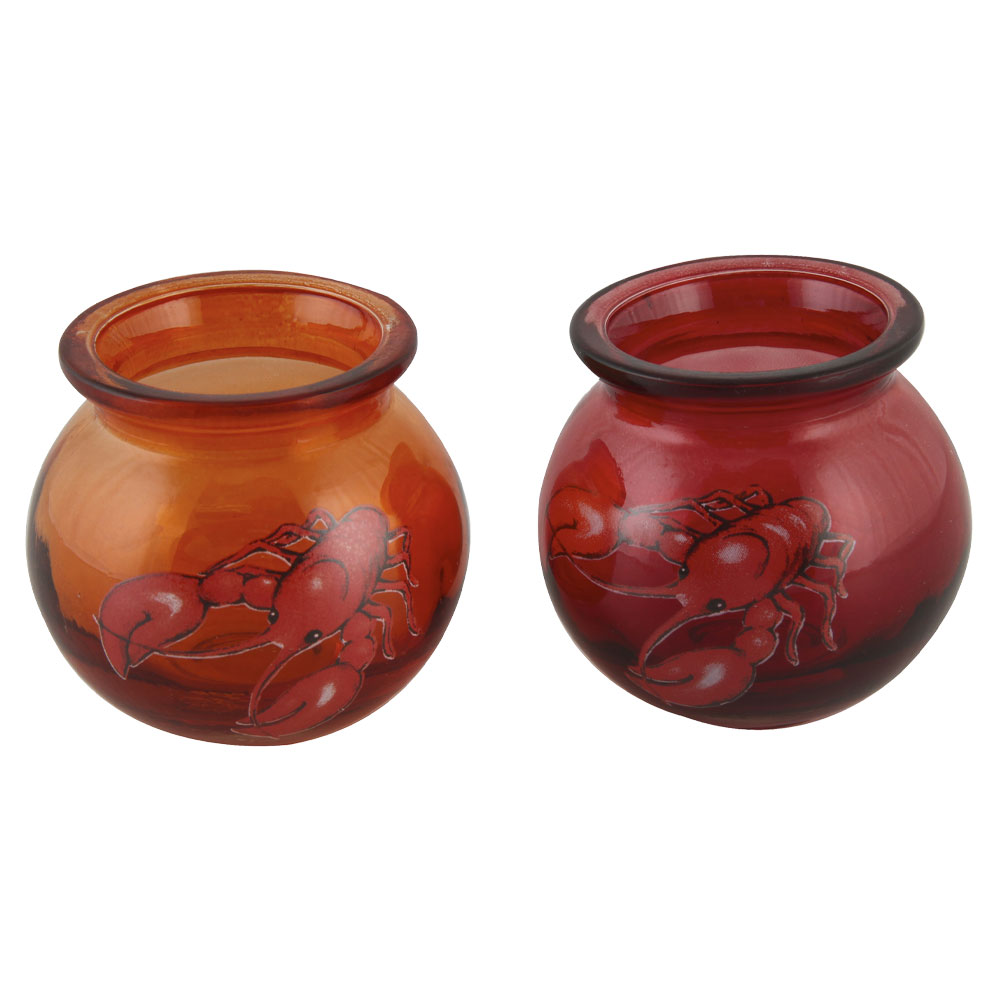 Värmeljuslykta Kräftskiva omfattar en 7 cm stor värmeljushållare av glas med fint kräftmotiv. Lyktan finns i orange och rött, vilken färg du får slumpas.