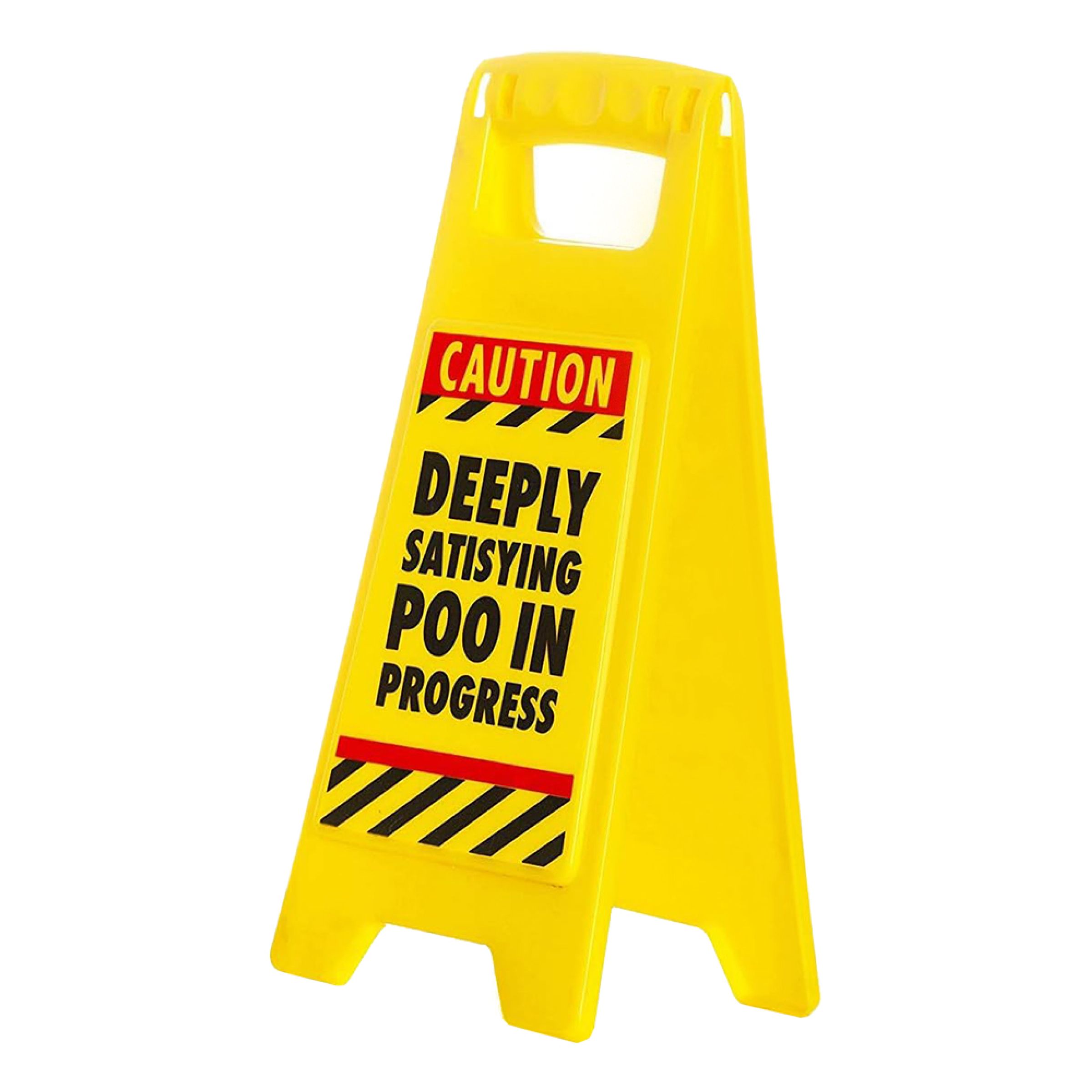 Varningsskylt Satisfying Poo är en gul varningsskylt som kommer med texten "Deeply satisfying poo in progress" på ena sidan, och "Give it 10 minutes" på andra. Perfekt att använda som kontorsprank eller när du vill helt enkelt vill varna din omgivning!