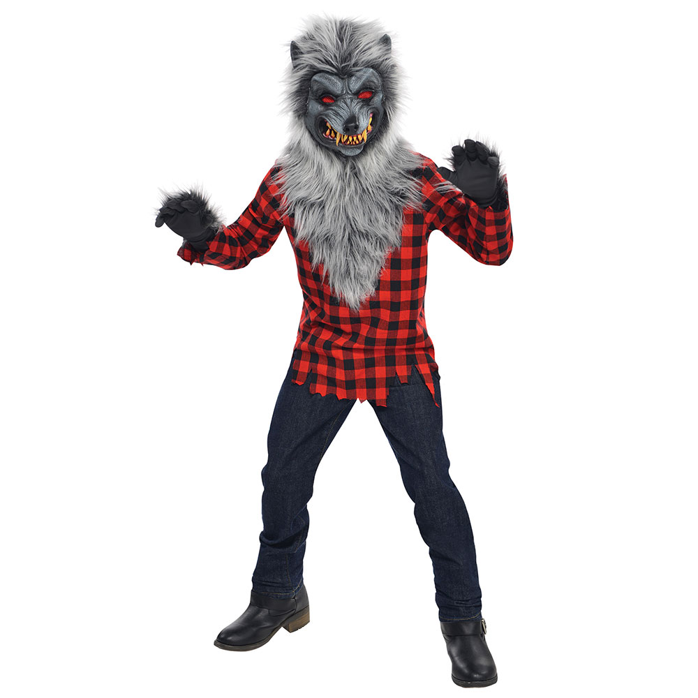 Varulvsdräkt med Mask Barn omfattar en röd/svart rutig tröja med fastsatt päls, handskar täckta i päls samt en heltäckande mask med päls. Maskens ansikte är i tyg.