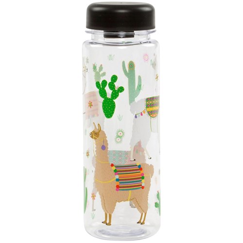 Dessa vattenflaskor är i klar plast med svart skruvkork och olika motiv. Välj mellan monstera eller lama!