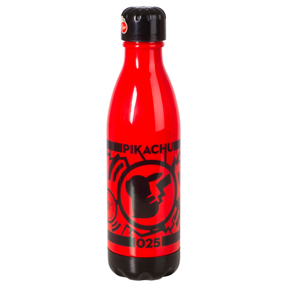 Vattenflaska Pokemon omfattar en vattenflaska i rött med svarta Pokémon motiv och text "Pikachu 025". Flaskan rymmer 660 ml och har en skruvkork.