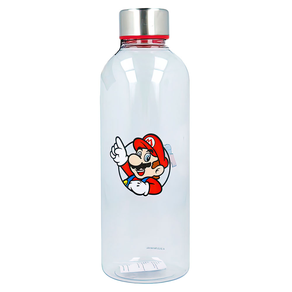Vattenflaska Super Mario omfattar en vattenflaska med Super Mario motiv i BPA-fri plast med spill- och droppsäkert metallock. Flaskan är transparent och rymmer 850 ml.