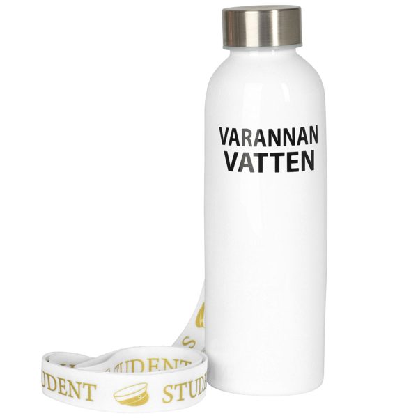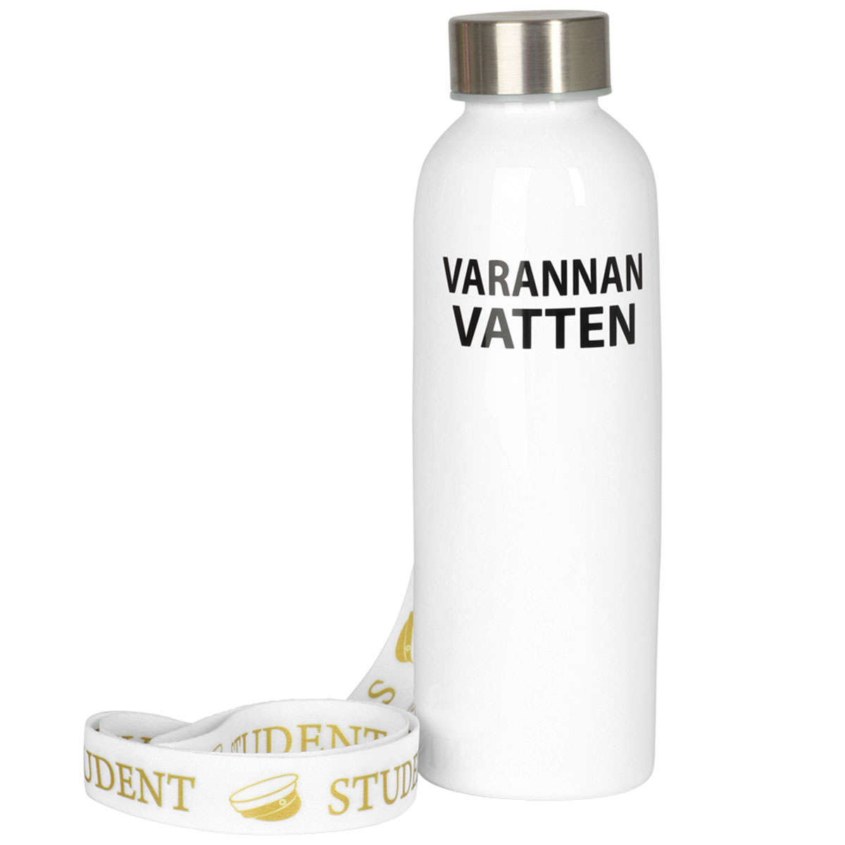 Vattenflaska Varannan Vatten omfattar en vit drickflaska med silverfärgat skruvlock och texten "VARANNAN VATTEN" i svart. Ett vitt band, dekorerat med studentmössor och texten "STUDENT" i guldfärg, medföljer så du kan bära den runt halsen.